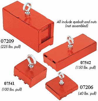 HOLDING AND RETRIEVING MAGNETS These magnets can be screwed or bolted to most surfaces. Attach a rope or chain to the eyebolt and go fishing for metal objects in tanks, vats, waterways or hard-to-reach places. Also, they can be used to hold spray nozzles, hoses, temporary wiring and more. Painted red.