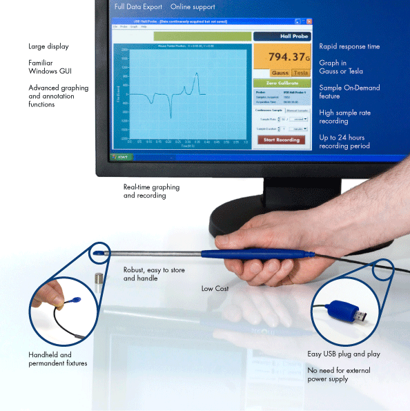 Low cost - No need for expensive gaussmeter/teslameter/voltmeter hardware to measure fields - replaced by easy-to-use USB software toolkit interface.