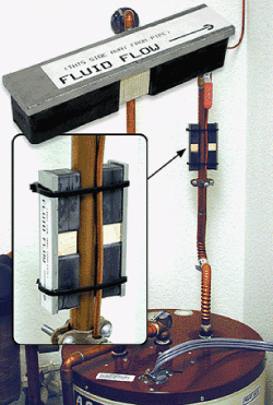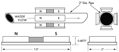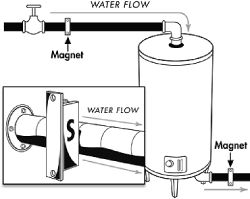 The WTMLM50P water treater is for all copper or plastic pipes up to 3/4" in diameter. The south pole of the magnet is designated with an "S". Waterflow direction should be from North magnetic pole to South magnetic pole. This illustration shows the proper application of this magnet to the pipe. Attachment can be made using wire, string, duct tape or hose clamp. The magnets should be installed on the pipe between the main valve and the water heater. A secondary unit may be installed on pipe that exits the water heater, if necessary.
