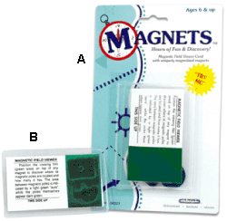 Astounding interactive package includes viewer card and three magnets. The special paper laminated in this amazing card shows the pole locations on any magnet. Two magnets may look the same physically but have radically different magnetization patterns. With this card you can see how many poles a magnet has, and where they are on the magnet. Ages 6 and up. |