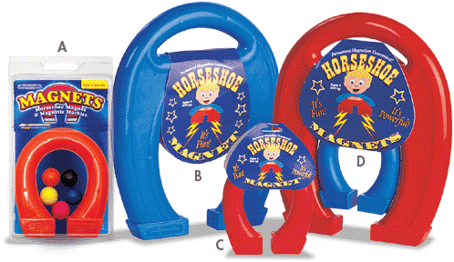 Giant 9" horseshoe magnet lifts up to 4 lbs. Available in red or blue. Ages 4 and up.