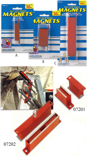 SUPER LATCH MAGNETSThese magnets lift, hold and retrieve metal objects up to 100 times their own weight! Use as small tool holders, door stops, magnetic clamps and paint fixtures, or separate magnetic from non-magnetic materials. |