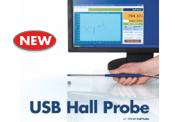 The USB Hall Probe uses Hall Effect sensing to measure magnetic flux densities, while the USB software toolkit replaces traditional gaussmeter display features by providing enhanced graph visualization and data logging support, all in real-time at a high display sampling rate. USB software functionality is an effective, low-cost alternative to expensive gaussmeter hardware, extending measurement possibilities by supporting both static and dynamic magnetic field measurement tasks.