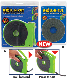 Allows you to "roll out" the desired length of 1/2" wide magnetic tape and then safely and easily cut the magnet with the press of a lever, all in a one-handed operation. The magnet has a strong, indoor craft adhesive on one side that is protected from exposure by a white, peel-off liner. This allows the user to cut multiple pieces in rapid succession and not worry about the adhesive being exposed until ready to use. Perfect for photographs, crafts, displays, school projects and more.